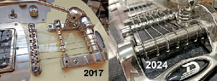 Nuestros trémolos tremola tienen un eje de 10 mm de diámetro, un poco mas que Bigsbys. Ademas tenemos cojinetes más precisos y mejores muelles, que permiten un punto cero exactamente definido en la posición de reposo.