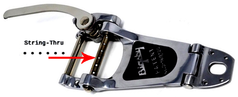 Ahora los Bigsby finalmente nos han imitado. ¡En lugar de 6 pasadores, ahora hay 6 agujeros! Pero estos agujeros están en el centro del eje, lo que hará que las cuerdas se doblen mucho al salir. ¡Riesgo de rotura! Y, por lo demás, estos trémolos tampoco mejorarán, porque siguen teniendo una colocación imprecisa de los cojinetes y ese resorte inadecuado.